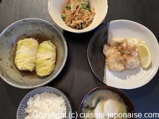 Ce mois-ci, je vous propose un bentô au « kayaku-gohan ». J’ai préparé le « kayaku-gohan » sous forme d’onigiri pour pouvoir mangez plus facilement avec les mains.