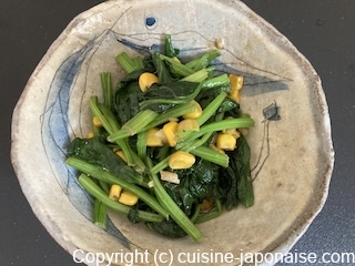 - Dans une poêle, chauffez l’huile d’olive avec l’ail haché. Faites-y sauter les épinards et les maïs. Salez et poivrez.