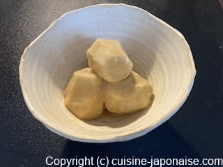 - Dans une casserole, mettez les sato-imo et couvrez-les d’eau. Faites blanchir pendant 10 à 15 minutes (vérifiez la cuisson). Égouttez.