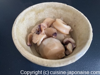 - Dans une casserole, mélanger les ingrédients du jus de cuisson et portez à ébullition. Ajoutez-y les sato-imo et le calmar. Posez un otoshibuta (couvercle plat de diamètre inférieur à la casserole ou un substitut en papier aluminium) dans la casserole directement sur les ingrédients. Laissez mijoter à feu moyen pendant 20 minutes en remuant de temps en temps.